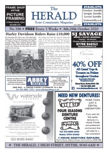 Page 20 • The HERALD • 8th October 2020 v ENCOURAGING LOCAL ENTERPRISE v WILLIS DECORATING & JOINERY SERVICES Est Since 1986 Interior & Exterior Painting & Decorating Wallpaper Hanging Hand-painted Kitchens & Spray Finishes Wardrobes, Bookcases, Radiator Covers Call David on 023 8084 9800 or 07946 048261 E: david.willis24@btinternet.com Acorn Building Contracts Ltd u Reliable, local builders offering affordable, quality workmanship u Our employees are fully qualified and fully insured u All aspects of building undertaken including extensions, structural alterations, roofing, ground works, kitchens, bathrooms, carpentry and plastering u Drawings arranged u Insurance work undertaken u Local Authority Approved Contractor For free quotations and friendly advice please call Office: 023 8024 3336 Mobile: 07786 656865 Email: acornbuilding@googlemail.com or visit our website: www.acorn-builders.co.uk You will not be disappointed HANNAH’S ELECTRICS Your Local Female Electrician NEED AN ELECTRICIAN? From simple upgrades to complete house re-wiring - and everything in-between, Hannah’s Electrics is the perfect choice. A trusted tradeswoman with sensible rates covering Southampton, New Forest & Waterside areas CONTACT HANNAH 07585 778136 W: www.hannahs-electrics.co.uk • E: hannahelectrics@gmail.com Like us on Facebook AUSTIN WINDOW CLEANING Professional Window Cleaning Service established 25 years £15 per house Tel: 07733 205341 www.austinwindowcleaning.co.uk FREE ESTIMATES • 10 YEAR GUARANTEE HYTHE: office.atlaswindows@gmail.com FAX/PHONE 023 8084 0441 Unit 2, Hardley Ind Est, Southampton ESTABLISHED FOR 30 YEARS THE LOCAL WINDOW COMPANY WITH THE BIG REPUTATION SUPPLY & INSTALL • Windows • Porches • Conservatories in PVCu • Doors • Choice of Colours & Woodgrain Send your local news to The Editor, The Herald, 2 High Street, Hythe SO45 6AH Waterside Women Need You! Established in 2016, ‘Waterside Women’ has gone from strength to strength reaching nearly 2,000 Facebook members and attracting more on a daily basis. Set up by group founder Sharon Kerr, initially to bring together similar minded, community focused, supportive women. Waterside Women (W.W) now have a committee of six who manage fundraising for local causes and raise awareness of local issues speci cally relevant to the women of the area. W.W is now raising in excess of £1,200 each month for local causes such as Oakhaven Hospice, Waterside Food Bank and e Honeypot Children’s Charity. Each week they have a hamper ra e and a monthly Lucky Ball Lottery, where members can win cash whilst adding to the fund pot. Recent fundraising e orts have enabled a new rescue sled to be purchased by the Stanswood Beach Rescue Charity based at Calshot Beach. Claire Hodge, Fundraising Manager for the charity thanks the Waterside Women directly: “We have taken ownership of our new rescue sled which you kindly purchased on behalf of Stanswood Beach Rescue. I, the trustees and the crew have been overwhelmed with your kind generosity. The Sudeste Rescue Sled was a vital addition to the service, the rescue sled attaches to the back of our rescue jet ski, allowing for a quicker approach to those who need an urgent response. We honestly cannot thank you enough and hope that once restrictions are lifted we can invite Waterside Women to our station at Calshot to see the crew and the rescue sled in action. Thanks again.” Calling local ladies to join the group, Waterside Women are now also accepting funding applications. To qualify, your local good cause or community project should ideally; fall within the SO45 postcode area, be used for treatment or special equipment for medical/mobility purposes or other local good causes. All applications will be considered and funding granted up to a maximum of £150. Applications are welcomed from all; you don’t need to be a charity. Application forms can be downloaded via the les directory on the Waterside Women Facebook page. New and Easy - Local Library Printing Service Printing a document at your local library is now even easier with Hampshire Libraries’ new email-to-print service. You don’t need to be a library member or log on to a library computer, simply email your document from any computer or smartphone and print it o within 72 hours using your unique ve-digit code at a participating library. Councillor Seán Woodward, Executive Member for Recreation and Heritage at Hampshire County Council, said: “Hampshire’s Library Service provides local communities with so much more than just exciting reads. In addition to a growing audiobook collection and activities such as Learning in Libraries courses, libraries also provide important community facilities such as computers and printers for the public to use. “As working and learning from home continue to be many residents’ new normal, providing a flexible and fuss-free printing service is another way that Hampshire’s Libraries are making people’s lives a little easier.” To use the service, anyone can email a document they’d like to print to library.print@hants.gov.uk to receive an automated email response with a ve- digit code. Printing can be collected at any participating branch by entering the print job code into a library printer and paying the correct change into the printer’s coin collector. Printing is available in A3 and A4 formats and charges range from 10p-80p per sheet depending on paper size and printing colour. is service is available at most Hampshire Libraries. Further information about printing documents at the library from any computer or mobile device is available at www.hants.gov.uk/librariesandarchives/ library/printing-documents To nd your nearest library, see opening times and check contact details, visit www.hants.gov.uk/librariesandarchives/ library/library nder