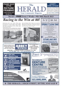 Est: 1994 v THE HERALD, 2 HIGH STREET, HYTHE, SO45 6AH v No 437 • FREE Every 3 Weeks • 9th-30th March 2023 The Your Community Magazine Gas and Electric Fires Fireplaces and Surrounds Full Installation Service Service/ Maintenance Call for a FREE Quotation 023 8084 0257 www.gasworks.co.uk Visit our showroom at 299 Shirley Road, Shirley, Southampton SO15 3HU To book a complimentary Consultation Appointment call 023 8066 8886 www.dentureconfidence.co.uk Steve Martin D.D. (Hons), Dip CDT RCS (Eng) Denturist, Clinical Dental Technician GDC number: 140520 THE COMPLETE DENTURE CENTRE Helping you rediscover your smile • Dentures that look like natural teeth • Denture repairs with On-site laboratory • Expert denture advice • Referral processes for ALL your dental needs • Relaxed atmosphere for anxious patients BEFORE AFTER E s t a b l i s h e d 2 0 0 4 Locally based in Langley • Domestic & Commercial SPRING CLEAN TIME • Professional Carpet Deep Cleaning • Hard Floor Cleaning (wood, stone, tile, laminate, Karndean) • All-Floor Sanitisation • Upholstery Deep Clean • Rug Deep Clean • Yacht and Maritime Soft Furnishings Deep Clean • Airflex Storm – top of the range carpet and soft furnishings cleaning system • End or Start of Tenancy carpets/floor scrubs • Fully Insured • Free Survey with zero obligation 07540 460 009 www.stormfloorcare.com stormfloorcare@gmail.com trained and certified • Reliable and Efficient Service • Serving Trade, Domestic and Commercial Customers • Three sizes of bags available GRAB BAGS - A CHEAPER FLEXIBLE ALTERNATIVE TO A SKIP Tel: 023 8081 1757 • www.abbeygrabbag.co.uk • Call us for Prompt Delivery of a Bag • Fill Like a Normal Skip • Call again for a swift collection. • We can also collect your own grab bags 15 Marsh Parade, Hythe 023 8084 4741 FRAME SHOP HYTHE PICTURE FRAMING ANXIETY - PANIC ATTACK? Stay Calm, in Control & Relaxed. Break Free from a Fear or Habit. Regain Confidence & Happiness. Fast & Effective, Lasting Results. Call 07786 376980 E: alan@alanjoneshypnotherapy.com Racing to the Win at 80! Marchwood motor racer Charles White drove his Lotus Elise to win his classes in both ACSMC (Association of Central Southern Motor Clubs) Hill Climb Championship and the ACSMC Sprint Championship recently. e two class wins were accomplished a er competing at tracks including Goodwood, Castle Combe, Lydden, Hethel, North Weald, Gurston Down, Wiscombe Park and Shelsley Walsh. Charles, who entered his 80th year last Autumn says: “I have been involved in Motorsport for over 60 years and I find it amazing to be winning championships at my age!” Charles receiving his Hill Climb Trophy at the ACSMC Award ceremony at Brooklands Charles on the start line at Gurston Down near Salisbury
