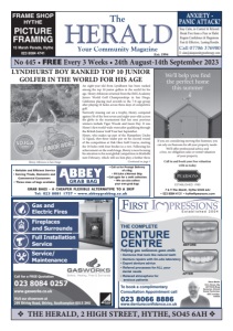 Est: 1994 v THE HERALD, 2 HIGH STREET, HYTHE, SO45 6AH v No 445 • FREE Every 3 Weeks • 24th August-14th September 2023 The Your Community Magazine ANXIETY - PANIC ATTACK? Stay Calm, in Control & Relaxed. Break Free from a Fear or Habit. Regain Confidence & Happiness. Fast & Effective, Lasting Results. Call 07786 376980 E: alan@alanjoneshypnotherapy.com To book a complimentary Consultation Appointment call 023 8066 8886 www.dentureconfidence.co.uk Steve Martin D.D. (Hons), Dip CDT RCS (Eng) Denturist, Clinical Dental Technician GDC number: 140520 THE COMPLETE DENTURE CENTRE Helping you rediscover your smile • Dentures that look like natural teeth • Denture repairs with On-site laboratory • Expert denture advice • Referral processes for ALL your dental needs • Relaxed atmosphere for anxious patients BEFORE AFTER E s t a b l i s h e d 2 0 0 4 Gas and Electric Fires Fireplaces and Surrounds Full Installation Service Service/ Maintenance Call for a FREE Quotation 023 8084 0257 www.gasworks.co.uk Visit our showroom at 299 Shirley Road, Shirley, Southampton SO15 3HU • Reliable and Efficient Service • Serving Trade, Domestic and Commercial Customers • Three sizes of bags available GRAB BAGS - A CHEAPER FLEXIBLE ALTERNATIVE TO A SKIP Tel: 023 8081 1757 • www.abbeygrabbag.co.uk • Call us for Prompt Delivery of a Bag • Fill Like a Normal Skip • Call again for a swift collection. • We can also collect your own grab bags 15 Marsh Parade, Hythe 023 8084 4741 FRAME SHOP HYTHE PICTURE FRAMING LYNDHURST BOY RANKED TOP 10 JUNIOR GOLFER IN THE WORLD FOR HIS AGE An eight-year-old from Lyndhurst has been ranked among the top 10 junior golfers in the world for his age. Henry Atkinson returned from the IMG Academy Junior World Golf Championships in San Diego, California placing tied seventh in the 7-8 age group a er playing 54 holes across three days of competitive golf. Narrowly missing out on a trophy, Henry competed against 50 of the best seven and eight-year-olds across the globe in the tournament that has seen previous winners include Tiger Woods and Jason Day. It was Henry’s rst world-wide event a er qualifying through the British Junior Golf Tour last September. Henry, who makes up part of the Hampshire Under 12 Squad, shot three under par on his second round of the competition at Oak Glen Golf Course, starting the 18 holes with four birdies in a row. Following his achievement on the world stage, Henry is now focusing his attention to his next global competition in Marbella next February, which will see him play a further three Henry Atkinson in San Diego Continued on page 3 7 & 9 The Marsh, Hythe SO45 6AJ • 023 8084 4131 • hythe@pearsons.com If you are considering moving this Summer, you can rely on Pearsons for all your property needs. We’ll o er professional advice and a free, no-obligation sales or rental valuation of your property. Call in and book your free valuation with us today