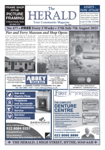 v THE HERALD, 2 HIGH STREET, HYTHE, SO45 6AH v No 477 • FREE Every 3 Weeks • 17th July-7th August 2025 Est: 1994 The Your Community Magazine To book a complimentary Consultation Appointment call 023 8066 8886 www.dentureconfidence.co.uk Steve Martin D.D. (Hons), Dip CDT RCS (Eng) Denturist, Clinical Dental Technician GDC number: 140520 THE COMPLETE DENTURE CENTRE Helping you rediscover your smile • Dentures that look like natural teeth • Denture repairs with On-site laboratory • Expert denture advice • Referral processes for ALL your dental needs • Relaxed atmosphere for anxious patients BEFORE AFTER Established 2004 ANXIETY - PANIC ATTACK? Stay Calm, in Control & Relaxed. Break Free from a Fear or Habit. Regain Confidence & Happiness. Fast & Effective, Lasting Results. Call 07786 376980 E: alan@alanjoneshypnotherapy.com 15 Marsh Parade, Hythe 023 8084 4741 FRAME SHOP HYTHE PICTURE FRAMING • Reliable and Efficient Service • Serving Trade, Domestic and Commercial Customers • Three sizes of bags available GRAB BAGS - A CHEAPER FLEXIBLE ALTERNATIVE TO A SKIP Tel: 023 8081 1757 • www.abbeygrabbag.co.uk • Call us for Prompt Delivery of a Bag • Fill Like a Normal Skip • Call again for a swift collection. • We can also collect your own grab bags 7 & 9 The Marsh, Hythe SO45 6AJ • 023 8084 4131 • hythe@pearsons.com Gas and Electric Fires Fireplaces and Surrounds Full Installation Service Service/ Maintenance Call for a FREE Quotation 023 8084 0257 www.gasworks.co.uk Visit our showroom at 299 Shirley Road, Shirley, Southampton SO15 3HU Pier and Ferry Museum and Shop Opens In time for Waterside Heritage Day on Saturday 26th June, a small museum of Hythe Pier, Train and Ferry artefacts, models and photographs opened in the once derelict, now restored former generator room just to the right of the Hythe Pier entrance. e building also houses a shop selling Hythe Pier Heritage Association (HPHA) merchandise and an array of excellent nely cra ed goods made by members of the Hythe Shed at the Pier. e project to restore the old Hythe Pier generator room, which was home to decades of discarded materials, an untold number of arachnids and other insects and vermin, was the brainchild of the late Allan Fairhead who sadly passed away before he could witness its coming into being. e volunteers from the Men’s Shed have worked tirelessly since the conversion started last September to bring Allan’s vision and imagination to an impressive reality. Among the artefacts on display are wherrymen’s prepier licence tokens, antique signage, models of the pier, train and former ferry boat Hotspur IV and vintage photographs. e museum and shop will be open on Tuesdays with additional hours under consideration. The new Hythe Pier Museum (Alan Titheridge) Inside the new Hythe Pier Museum Shop (Alan Titheridge)