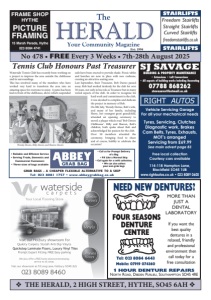 v THE HERALD, 2 HIGH STREET, HYTHE, SO45 6AH v No 478 • FREE Every 3 Weeks • 7th-28th August 2025 Est: 1994 The Your Community Magazine Vehicle Servicing Garage For all your mechanical needs Tyres, Servicing, Clutches Diagnostic work, Brakes Cam Belts, Tyres, Exhausts, MOT’s arranged Servicing from £69.99 See main advert page 83 Free local collection Courtesy cars available 114-118 Hampton Lane, Blackfield SO45 1UB www.rightautos.co.uk • 023 8089 0600 STAIRLIFTS STAIRLIFTS Freedom Stairlifts Straight Stairlifts Curved Stairlifts freedomstairlifts.co.uk FOUR SEASONS DENTURE CENTRE MORE THAN JUST A DENTAL LABORATORY If you want the best quality dentures in a relaxed, friendly and professional environment then call today for a free consultation Tel: 023 8084 6443 Mobile: 07919 074360 1 HOUR DENTURE REPAIRS North Road, Dibden Purlieu, Southampton SO45 4RE NEED NEW DENTURES? SJ SAVAGE BUILDING & PROPERTY MAINTENANCE • Extensions • Loft Conversions • All aspects of building works including Decorating 07788 868262 stevesavo@hotmail.co.uk Quickstep Laminate Floors, Luxury Vinyl Tiles • Reliable and Efficient Service • Serving Trade, Domestic and Commercial Customers • Three sizes of bags available GRAB BAGS - A CHEAPER FLEXIBLE ALTERNATIVE TO A SKIP Tel: 023 8081 1757 • www.abbeygrabbag.co.uk • Call us for Prompt Delivery of a Bag • Fill Like a Normal Skip • Call again for a swift collection. • We can also collect your own grab bags 15 Marsh Parade, Hythe 023 8084 4741 FRAME SHOP HYTHE PICTURE FRAMING Tennis Club Honours Past Treasurer Waterside Tennis Club has recently been working on a project to improve the area outside the clubhouse and its surroundings. is has involved many of the members who have worked very hard to transform the area into an amazing space for everyone to enjoy. A patio has been laid in front of the clubhouse, above which suspended sails have been erected to provide shade. Picnic tables and benches are now in place with new cushions, creating an attractive seating area. Last September, their Treasurer, Bob Davies passed away. Bob had worked tirelessly for the club for over 30 years, not only in his role as Treasurer but in many varied aspects of the club. In order to recognise his hard work and commitment to the club, it was decided to complete and dedicate the project in memory of Bob. On 8th July, Wendy Davies, Bob’s wife, and many of her family, including Harry, her youngest great grandchild, attended an opening ceremony to unveil a plaque which read ‘Bob Davies Clubhouse’. Billy and Sharon, Bob’s children, both spoke about Bob and acknowledged his passion for the club. Over 50 members attended the ceremony, bringing food to share and of course, bubbly to celebrate the occasion! Wendy Davies, Billy Davies and Sharon Davies