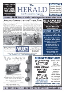 v THE HERALD, 2 HIGH STREET, HYTHE, SO45 6AH v No 480 • FREE Every 3 Weeks • 18th September-9th October 2025 Est: 1994 The Your Community Magazine Vehicle Servicing Garage For all your mechanical needs Tyres, Servicing, Clutches Diagnostic work, Brakes Cam Belts, Tyres, Exhausts, MOT’s arranged Servicing from £69.99 See main advert page 79 Free local collection Courtesy cars available 114-118 Hampton Lane, Blackfield SO45 1UB www.rightautos.co.uk • 023 8089 0600 FOUR SEASONS DENTURE CENTRE MORE THAN JUST A DENTAL LABORATORY If you want the best quality dentures in a relaxed, friendly and professional environment then call today for a free consultation Tel: 023 8084 6443 Mobile: 07919 074360 1 HOUR DENTURE REPAIRS North Road, Dibden Purlieu, Southampton SO45 4RE NEED NEW DENTURES? Quickstep Laminate Floors, Luxury Vinyl Tiles STAIRLIFTS STAIRLIFTS Freedom Stairlifts Straight Stairlifts Curved Stairlifts freedomstairlifts.co.uk SJ SAVAGE BUILDING & PROPERTY MAINTENANCE • Extensions • Loft Conversions • All aspects of building works including Decorating 07788 868262 stevesavo@hotmail.co.uk 15 Marsh Parade, Hythe 023 8084 4741 FRAME SHOP HYTHE PICTURE FRAMING • Reliable and Efficient Service • Serving Trade, Domestic and Commercial Customers • Three sizes of bags available GRAB BAGS - A CHEAPER FLEXIBLE ALTERNATIVE TO A SKIP Tel: 023 8081 1757 • www.abbeygrabbag.co.uk • Call us for Prompt Delivery of a Bag • Fill Like a Normal Skip • Call again for a swift collection. • We can also collect your own grab bags Another Swashbuckling Pirate Day! Hundreds of Pirates descended on Hythe for the village’s second Pirate Day on 23rd August, which was once again a swashbuckling success. Organised by Hythe Alive, Pirate Day started with a parade of pirates from Hythe Marina through to the village, led by the fabulous trio of giant carnival style pirate puppets that were specially commissioned last year by Culture in Common and handmade by members of Hythe Alive with help from New Forest artists Emily and Heidi. e giant pirate rat and two cats, led the pirate crews into the centre of the village where the Town Crier welcomed everyone to Hythe’s Pirate Day and thanked those who had joined the parade. Pirates could buy a special loot bag from outside Toys Ahoy, complete with a treasure trail map, eye patch, telescope, tattoos and stickers. e rst 75 pirates to collect their maps each received a bonus gi of a squishy hard hat thanks to Trant. TMT LLP Legal Services sponsored the pens given out to the pirates to help them to complete their treasure trails. Pirate Day Parade Continued on page 3