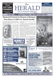 v THE HERALD, 2 HIGH STREET, HYTHE, SO45 6AH v No 481 • FREE Every 3 Weeks • 9th-30th October 2025 Est: 1994 The Your Community Magazine ANXIETY - PANIC ATTACK? Stay Calm, in Control & Relaxed. Break Free from a Fear or Habit. Regain Confidence & Happiness. Fast & Effective, Lasting Results. Call 07786 376980 E: alan@alanjoneshypnotherapy.com Gas and Electric Fires Fireplaces and Surrounds Full Installation Service Service/ Maintenance Call for a FREE Quotation 023 8084 0257 www.gasworks.co.uk Visit our showroom at 299 Shirley Road, Shirley, Southampton SO15 3HU To book a complimentary Consultation Appointment call 023 8066 8886 www.dentureconfidence.co.uk Steve Martin D.D. (Hons), Dip CDT RCS (Eng) Denturist, Clinical Dental Technician GDC number: 140520 THE COMPLETE DENTURE CENTRE Helping you rediscover your smile • Dentures that look like natural teeth • Denture repairs with On-site laboratory • Expert denture advice • Referral processes for ALL your dental needs • Relaxed atmosphere for anxious patients BEFORE AFTER Established 2004 • Reliable and Efficient Service • Serving Trade, Domestic and Commercial Customers • Three sizes of bags available GRAB BAGS - A CHEAPER FLEXIBLE ALTERNATIVE TO A SKIP Tel: 023 8081 1757 • www.abbeygrabbag.co.uk • Call us for Prompt Delivery of a Bag • Fill Like a Normal Skip • Call again for a swift collection. • We can also collect your own grab bags 15 Marsh Parade, Hythe 023 8084 4741 FRAME SHOP HYTHE PICTURE FRAMING 7 & 9 The Marsh, Hythe SO45 6AJ • 023 8084 4131 • hythe@pearsons.com Memorial Festival in Honour of Romsey Man Raises £2,000 For Mental Health A music festival held in memory of Joe Godden, a beloved member of the Romsey community, has raised an impressive £2,000 for Hampshire’s largest mental health charity, Solent Mind. a creative outlet for him, and he was a successful musician locally. Joe’s passion for music and his incredible energy touched the lives of many. In tribute to him, 4 of his close friends organised JoeFest, a festival that would bring together his two passions. Held at e Bishop Blaize pub, and opened by the Mayor of Romsey, the August festival brought together more than 300 people for a day of live music, connection and remembrance. e line-up featured singer/songwriters and bands with personal ties to Joe. ere was also a show stopping performance from Joe’s nephew, Toby Campbell, who took to the stage with Joe’s cousin and close friend, George Dummett, to perform Joe’s original song ‘If I Had the Chance’. e atmosphere was emotional but also a celebration of Joe’s life and legacy. Abbie Bartley, 30, one of Joe’s friends and organisers of the festival, said: “Music was a big thing for Joe, and Joe Godden Continued on page 3 Joe was only 28 when he died in April last year. He was known for his love of music and his commitment to raising awareness of mental health, particularly in men. Over the years, Joe had his own battles with mental health and was never shy about sharing his thoughts, feelings and emotions publicly. Music was