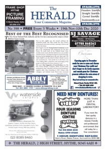 Please phone or email for detailed list. Colin van Geffen 023 8089 7793 cvg@hotmail.co.uk BRITISH RED CROSS, various talks available on our work and services in the UK and Overseas for donation. Contact the Community Fundraising Department 023 9289 4205/023 9289 4206, PFalck@ redcross.org.uk or PaulineGibson@redcross.org.uk CHARITY SPEAKER – available to talk about local charity ‘The Honeypot Children’s Charity’. Tel: Viv 023 8089 0002. CHARITY SPEAKER – Do you want to know more about Cancer Research UK, our work in your town, progress and how Gifts in Wills are helping to make breakthroughs. Contact Stuart.Amey@cancer.org.uk or 01425 278367 CHARITY SPEAKER – to give talks on ‘Hearing Dogs for Deaf People’, will also bring my dog. Call Stephen 023 8046 5019 or email yogiboo3162@yahoo.co.uk AVAILABLE ON ZOOM - new talk to compliment my very popular New Forest Pony talks. The New Forest-a landscape shaped by grazing and the ancient tradition of commoning. I am a breeder and a practising commoner who loves to take photographs of this beautiful area and share with my own experience of commoning through the year. Suzanne Kempe 01590 675854 or email suzannekempe@ uwclub.net ENTHUSIASTIC SPEAKER available to give illustrated talks on Vintage Vehicles, Steam, Commercials, Fairground, etc. Could be available short notice, call Bob on 023 8081 3341 for list of titles and fees etc. FAMILIES MATTER is a local charity based in Hythe, which helps families in need. Charity speaker available for groups to give an illustrated talk about its work. Tel: Julia 023 8020 7623 for details. INTERESTED IN: ‘Sustainability in Business’ or ‘Sustainable/Responsible Tourism - What is it and Why Care?’ Speaker available at short notice. Talks based on our own sustainability journey. For more information - call Alexandra (Alexandra’s Africa) on: 023 8048 8708 or Email: info@alexandrasafrica.com LOCAL HISTORY TALKS from lifelong resident and experienced speaker. Available at relatively short notice. Titles are ‘From the Heath Hotel to Dibden Church, an historical journey’; History of Dibden Purlieu 1900 to 1960’; Then & Now images of Dibden and Dibden Purlieu’; Growing up in Dibden Purlieu in the 1950’s; in conjunction with Alan Lines ‘From a photograph to a War Memorial’; and ‘Robert Gerard Fox; the Kaiser’s Tutor’, ‘Langdown Lawn (Golden Hind Park)’ and New for 2020 ‘Fred Nicklen – The Road to Lismany’. Telephone Gordon Chambers 023 8084 4749. MAGIC BEHIND the Scenes, talk and magic interwoven for a fascinating insight into the world of magicians. Roger Daniels, Member of the Magic Circle, 023 8084 3537 or 07718 489327. MINSTEAD TRUST and Furzey Gardens: For your community group, association or gardening group – available ONLINE or IN PERSON Charity speaker, to talk about the history to present day of Furzey Gardens and Minstead Trust, local learning disability charity. Sharing lots of horticultural knowledge, how the plant hunters made their discoveries, beautiful images to share, and how the charity today is working to help vulnerable people in society. Get in touch with Lesley.brooks@minsteadtrust.org.uk OPEN SIGHT, Hampshire’s principal sight awareness & support Charity, can visit your afternoon Social Club or Group to give its presentation ‘Keeping Your Eyes Right’ which covers advice on good eye health care and tips on sight loss prevention. A donation to Charity funds is appreciated. Call Terry Smith on 023 8064 6377 to book. SPEAKER WILL travel anywhere in Hampshire. Three main talks: The Humorous Poet, 30 Years of Writing Pantomimes and Making People Laugh and Cry with Verse. Available at short notice call 023 8073 5254. SPEAKER on movies, musicals, jazz and classic pop, 1900-1955, live or remote. For details mggarber@ ol.com , www.michaelggarber.com or call 07375 428454. WASTE & RUBBISH RECYCLING Fast Friendly Service • Cheaper than a skip Domestic & Commercial and building waste Fully Insured and Licensed with Environment Agency We Remove Anything NEW FOREST RECYCLING 07808 125453 RECYCLING Paper from responsible sources FSC ® C020438 MIX ® The Herald is printed on FSC certified material TROPHIES & ENGRAVING v EMAIL THE HERALD ON editor@herald-publishing.co.uk v WANTED 19th November 2020 • The HERALD • Page 63 VOLUNTEERING OPPORTUNITY u HERALD CLASSIFIEDS u TUITION THE FRIENDS of Testvale Surgery in Totton have vacancies for members to help run this small charity with funds to support all patients of our practice. We also need volunteers who can spare 2-3 hours per week to help patients to use the automated blood pressure and bodymass index monitors and access medical and social resources available in our walk in support centre. Appropriate training and support will be provided. Call Ken 023 8086 7650 or Friends of Testvale 023 8086 2130, leave a message on the answering machine and we will return your call as soon as possible. WATERSIDE SCRAPSTORE supplies donated materials to its members for art and craftwork. Trustees plan to expand the business and are seeking more volunteers to assist with a choice of tasks including fundraising, publicity, trusteeship and helping in their shop in Totton. If you think you might be interested, would like to know more, or you represent a group and would like to become a member, or have materials to donate contact 023 8081 4314. ART CLASSES private or at the Community Centre. Hythe, Monday evenings and Friday mornings call Derek on 07598 935902 for more details. ENGRAVING SERVICE. Hythe Trophy Centre - call John 07885 507627 please leave a message or text or email: hythe.trophies.fawley@gmail.com old and new. Take them into The Herald office at 2 High Street, Hythe, SO45 6AH who take them in for two charities - Relate Solent & Winchester and Hythe Pier Heritage Association. WANTED – Honda C90 Cub motorcycle, would prefer 1998 or earlier model, ideally one owner, low mileage, in very good condition.