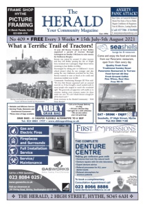 15th July 2021 • The HERALD • Page 51 v THE HERALD IS PUBLISHED EVERY 3 WEEKS v Let us help you make life easier Contact Waterside Home Help and Companions today to find out how we can help you and your family. We offer a range of home help & companionship services: ● Cleaning and laundry ● Grocery shopping and errands ● Meal preparation ● Transport to appointments ● Companionship ● Welfare checks ● Medication prompts ● Sitting service ● We will match you with a fully trained, insured and DBS checked helper to suit your individual needs. ● The same helper will visit you at the same time each day, week, fortnight or whenever required. ● We do not provide personal care, therefore our rates are considerably lower ● £15 per hour Call us today on 07565 428139 Or email us on: info@watersidehomehelp.co.uk Visit our website: www.watersidehomehelp.co.uk WE CARE, YOU CARE e Evergreen Club for the over 60’s are now hoping to welcome members back to St John’s Hall, New Road, Hythe on Thursday 5th August for tea and a social a ernoon. e following meeting on Thursday 19th August will be a talk by Colin van Ge en ‘Calshot, A Place in Time’. ey will con rm these dates by telephone nearer the time. For more details about the Evergreen Club, contact Peter on: 023 8089 1721. EVERGREENS CHALLENGE COMPLETED There was the Challenge – could they outrun a county Ambulance? Run… no way… but walking would get them out and about and hopefully a little tter. Seven residents and the manager at Popes Court Retirement Apartments in Totton, took up the Challenge during May. Short and longer distances were recorded and at the end of the month they had walked between them 166 miles – much more than an ambulance travels in one day! At the same time, they were raising funds for the South Central Ambulance Service Charity. With their sponsorship money and donations from many other residents they were able to present to the Charity £690 to one of their local volunteer Community First Responders, enough to pay for training and retention for a responder for two years. Good news! e Hythe Huddle is due to re-open on Wednesday 1st September from 2pm until 4pm. Places will be limited initially, so please phone Families Matter on: 023 8020 7623 leaving your name(s) and phone number to book a place at the next meeting. e Huddle will be run much the same as before, with music or other entertainment each month, tea and co ee and biscuits. e Hythe Huddle is for people with dementia and their carers. It will be based, as previously, in the hall at Cornerstone Hythe URC, New Road, Hythe Government guidance in place at the time. An activity programme is coming soon but future dates for your diary will be: 1st September, 6th October, 3rd November, and 1st December. SO45 6BR. All previous and new members welcome, but please phone first to book. Face masks and social distancing may still be needed, according to HYTHE HUDDLE RE-OPENING Hythe Huddle enjoying ‘Folk Galore’