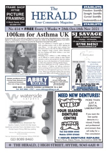 Page 70 • The HERALD • 28th October 2021 v SAY YOU SAW IT IN THE HERALD v COMPUTERS HOBBIES LOCAL HISTORY HOUSEHOLD u HERALD CLASSIFIEDS u CLOTHING & ACCESSORIES BLACK M&S suede boots, heel 3.5cms, size 6, £8. Tel: 07544 406491. CLOTHES DON’T FIT? Donate them to the Cancer Research UK Shop, Church Street, Romsey. 92p in every £1 raised goes towards research. STEEL CAPPED safety boots, size 11, worn once, £6. Tel: 07544 406491. GARDEN TOOLS INTERESTED IN our local history, then visit Waterside Heritage at their centre at the Old Railway Centre in Dominy Close, off Shore Road, in Hythe. Extensive collection of documents and photographs covering the Fawley, Hythe and Dibden Purlieu areas in particular. Open Thursday and Saturday mornings from 10.15am and on Tuesdays by appointment. Contact Graham Parkes on: 023 8084 4074 or Gordon Chambers on: 023 8084 4749. 18” CHAINSAW, used once, £35ono. Chainsaw jacket and trousers, never used, still in boxes, £40ono. Waders, size 9½, £30ono. Tel 023 8084 4397. FLYMO CHEVRON 32v, 12” electric mower, with back roller, ideal for a small lawn, little used, £30. Tel: 023 8028 3635. WEED BURNER, new, £15. Tel: 07544 406491. HMS Dieppe LST static display model or diorama, 7 feet long, lots of brass fitting, good for clubs etc, open to offers. Phone Jim on: 07856 616684 (Barton on Sea). MODEL RAILWAY SET, 6ft 4 inches x4ft table with folding legs. Contents include:- 2 x trains with coaches; 1 x electric model with carriage; 2 x shunters with 8 open trucks; 2 x shunters with 6 closed trucks. All of this is in a village setting with three stations houses, pub, farm, church etc, and lights up at night. Price: £800ono. Buyer collects. Please call Bill on: 07967 717780 for further details. BOOKS DENON M37 Stereo system with DAB and FM radio, CD player together with M38 Speakers, hardly used, excellent condition, a bargain at only £125. Buyer to pay cash please. Tel: 023 8066 0179. BABY EQUIPMENT GARDEN WATER fountain in the shape of segmented orange, approx. 36cms high, as reservoir and meal grid, pump and outside switch, if required, £65ono. Tel: 07742 392567. MIRROR in gilt frame, 24”h x 17”w, excellent condition, £25ono. Collect East Boldre. Tel: 01590 626226. PRETTY FREESTANDING dressing mirror, very pretty, £20ono. Tel: 023 8051 0756. SPRAY FLOOR MOP, as new, never used, cost with detergent £26, sell for £10. Tel: 023 8066 0061. HEALTH & BEAUTY GARDEN FEATURES 1 PACK of face coverings, fabric mask with filter. Pocket, washable protective mask, 100% cotton protective unisex face mask with nose wire, £1.50 each. Tel: 07427 302656 (local). GARDEN SERVICES COMPUTER CHAIR (black), £20 ono. Tel; 023 8089 8294. ELECTRIC RISER/RECLINER chair, blue and white check material, dark blue vinyl seats and leg rest, Design model ‘The Lateral’ 3 years guarantee still available. Open to reasonable offers. Tel: 023 8086 3237. FOUR SECTION buffet warmer, new, never used, still wrapped, £15. 2 cup coffee machine, Phillips Senco, £4. Ice cream machine, with instructions, £4. Tel: 07544 406491. GREAT LITTLE chair, wooden, both sides with cushions arms, 1930’s style, cushions need repairing, measurements height to seat 15”, to arms 21”, back solid 27” height, width 20”, depth 16”, £25ono. 2 Deckchairs, £2 each. Collect East Boldre. Tel: 01590 626226. GTECH POWER floor K9 cordless vacuum cleaner, hardly used, cost £200, Model no. ATF039, would accept £75ono. Computaplace Computer Servicing & Accessories Inks & Consumables New Laptops & Desktop Computers from stock or built to order Mobile Call Out Service Help Setting up Broadband & Wireless 023 8000 2002 info@computaplace.com 75a Long Lane, Holbury SO45 2ND Digiserv Ltd Shed and Greenhouse Demolition & Removal Fully Insured and Licensed with Environment Agency NEW FOREST RECYCLING on 07808 125453 HOUSE, GARAGE & GARDEN CLEARANCE Fully Insured and Licensed with Environment Agency • Cheaper than a skip • Fast Friendly Service NEW FOREST RECYCLING on 07808 125453 STRADA VAN SERVICES (formerly “Hythe Man & Van”) Local Removals & Furniture Moves Waste License Holders • Fully Insured Family Business • Competitive Rates Phone/Quotes: 07811 641877 www.StradaVanServices.com MAN & VAN SPORTING BOOKS – 40 Manchester United, £20. 16 Liverpool, £20. 15 Snooker £20. 14 Speedway, £20. Phone enquiries welcome for further details. Tel: 023 8074 1716 DECORATING EQUIPMENT ‘BAL’ tile adhesive and grout, for walls. Evo-stik wall tile adhesive. Approx ½ tub of each, subject to needs, £5 each. Tel: 023 8081 5305. AUDIO VISUAL BABY PLAYPEN, Easylock, makes hexagon/rectangle, £35. Baby Dan stair/door gate extendable 90cm-147cm, £25. Lindam stairgate, 63.5cm-102cm, £15. Tel: 023 8089 3561. HOLIDAYS & OUTINGS KINROWAN PARK Holidays Cornwall. Bargain Prices. Dogs welcome. Short breaks or longer to suit you, please contact us for details. Family run picturesque site in Cornwall, near Looe and Polperro etc. 40 minutes from the Eden Project. Self- Catering Holidays, Luxury Lodge, Bungalow or Static Caravans. Pitches also available for camping, touring caravans and motorhomes. Phone: 01503 241252 or: 07980 176428 or email: sales@kinrowanparkholidays. co.uk Web: www.kinrowanparkholidays.co.uk BICYCLES GENTS UPRIGHT Cycle, make Bronx model 18 gears plus safety locks etc. Reasonable offers accepted. Tel: 023 8086 3237. MASTERSPARES Domestic Appliance Sales, Spares & Repairs MAIN STOCKIST IN THE WATERSIDE OF SPARES FOR MOST MAKES OF DOMESTIC APPLIANCE Sales for most appliances from kettles to washing machines £10 OFF MIELE and SEBO vacuum cleaners on production of this advertisement Repairs carried out on most appliances 43 Hollybank Crescent, Hythe Tel: (023) 8084 4338 u FREE PARKING • www.masterspares.com GARAGE IN HYTHE wanted to buy for cash or rent 7ft door for car only Tel: 07773 076833 PASSENGER SHIP MOVEMENTS (A ll details are provisional and may be subject to alteration withou