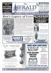 Page 24 • The HERALD • 9th December 2021 v INDEPENDENT, LOCAL AND PROUD v • Airport & Seaport Specialists • Highly Competitive Fares • Friendly, Reliable Service • Comfortable 6 Seater MPVs • Any Distance - Minimum Fare £10 Before booking your journey please call us for a free quotation 07770 967198 or 023 8194 8754 www.kazcarz.co.uk FOR QUALITY AND SERVICE • DOMESTIC AND COMMERCIAL WORKS • DISABLED FACILITIES Hardley Industrial Estate, Hythe, Southampton Telephone: (023) 8084 9999 Fax: (023) 8084 9999 • Mobile: 07836 525286 E stablished 1955 Professional installers of Fascias, Guttering, Cladding, PVCu Windows & Doors Composite Doors • 10 year labour and product guarantees Repairs, cleaning and advice also available Tel: 023 8086 9715 or 07888 705455 enquiries@aztecfascias.com M.D.S. DIGITAL INSTALLS/SERVICE • DIGITAL AERIALS/FREEVIEW • SKY DIGITAL/FREESAT DIGITAL • EXTRA TELEVISION POINTS • TELEPHONE LINES/POINTS • TELEVISION SYSTEMS SETUP/TUNED • WALL MOUNTED TV’S QUALIFIED, FAST FRIENDLY SERVICE FREE SURVEYS/QUOTES BEAULIEU: 01590 611011 MOBILE: 07717 194441 Ogilvy Property Services • Painting & Decorating • Kitchens & Bathrooms Supplied and Fitted • Tiling Walls/Floors • Plumbing • General Property Maintenance • Prompt & Free Quotes • No Job Too Small Tel: 023 8087 1187 Mobile: 07786 960101 www.ogilvypropertyservices.co.uk Detectives Descended on the New Forest Amateur sleuths discovered whodunit in a murder mystery event to raise funds for learning disability charity Minstead Trust. Guests arrived at the atmospheric Minstead Lodge in the New Forest in September dressed in Victorian style clothing ready to use their detective skills to uncover the mysterious goings-on at this sell out event. During the evening, guests were treated to a two course meal whilst actors from Organise Events played out the scene and provided clues for the teams to piece together the mystery. Generous sponsors donated ra e prizes which included thrive and live more independent lives. As a local charity, we want to inspire people to learn more about the great things that people with learning disabilities are achieving, and how they, as new supporters of our charity can be part of the Minstead Trust’s community of support.” Overall £1,385 was raised which will go towards helping Minstead Trust continue to o er training and support to improve the lives of people with learning disabilities. As well as direct support for people with learning disabilities, the Trust runs social enterprises Furzey Gardens, Hanger Farm Arts Centre and Minstead Lodge events venue. All of these social enterprises o er work experience for people with learning disabilities. e next murder mystery event will take place in 2022 with details being posted on Minstead Trust’s website. If you would like to nd out more about Minstead Trust or how you can get involved with the charity or any of the events, please visit: www.minsteadtrust.org.uk Guests arrive at Minstead Lodge a hamper of wine, a £100 decorating voucher from Brewers and an interior design co ee table book by Kit Kemp. Lesley Brooks, Fundraising Co-ordinator at Minstead Trust, said: “The murder mystery dining event in aid of Minstead Trust is a really popular evening and it was lovely to welcome familiar faces and new ones to our first indoors in person event in such a long time. Events like these help raise important funds supporting our work, helping people with learning disabilities to Totton & District Gardeners’ Society urgently need a Chairman and Treasurer to allow them to continue into 2022. Meetings have been held on the 2nd Wednesday in the month at Totton ree Score Club Hall, with Committee Meetings held once a month. e Society was founded in 1954, their membership is now over 100; a reason why they are so desperate to continue. If you are able to help, please contact Mary on: 023 8029 2761. The Waterside Probus Club Announces its Spring Programme e club meets every month at the Dibden Golf Centre. Members get together for a co ee followed by an interesting talk from a guest speaker and then sit down for a two course lunch. Talks for Spring 2022 have been booked. In January the topic is “ e Longest Journey”, which looks at how far you could travel by train from your local station. February’s talk is entitled ‘Tales of a Roving Reporter’, anecdotes from the unfortunate experiences of a radio reporter. In March the talk is called ‘Fields, Fergies and Fairs’. If these talks are of interest to you why not become a member of the Waterside Probus Club. Talks on a wide range of topics are being arranged for the rest of 2022. For more information email the Club Secretary at: watersideprobus@ outlook.com Can You Help Totton Gardeners Society? Friendly, family business Boiler Breakdowns • Servicing & Maintenance Landlord Inspections • Installations Nick and Sarah-Jane 07840 684760 forestedgeheating@hotmail.com