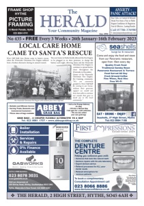 Est: 1994 v THE HERALD, 2 HIGH STREET, HYTHE, SO45 6AH v No 435 • FREE Every 3 Weeks • 26th January-16th February 2023 The Your Community Magazine Call for a FREE Quotation 023 8078 3031 www.gasworks.co.uk Visit our showroom at 299 Shirley Road, Shirley, Southampton SO15 3HU Hythe, Waterside & New Forest: 023 8084 0257 Boiler Installation Services & Repairs 0% Finance Available Accredited Installer lounge bar & restaurant Seashells, 37 High Street, Hythe Tel: 023 8084 7188 EAT • DRINK • ENJOY Come and enjoy the food and views from our Panoramic restaurant, open from 10am every day Quality Fresh Food Traditional Sunday Roast Panoramic Restaurant & Terrace Food Served All Day Fresh Ground Coffee Fine Wines, Real Ales Free Wi-Fi To book a complimentary Consultation Appointment call 023 8066 8886 www.dentureconfidence.co.uk Steve Martin D.D. (Hons), Dip CDT RCS (Eng) Denturist, Clinical Dental Technician GDC number: 140520 THE COMPLETE DENTURE CENTRE Helping you rediscover your smile • Dentures that look like natural teeth • Denture repairs with On-site laboratory • Expert denture advice • Referral processes for ALL your dental needs • Relaxed atmosphere for anxious patients BEFORE AFTER E s t a b l i s h e d 2 0 0 4 ANXIETY - PANIC ATTACK? Stay Calm, in Control & Relaxed. Break Free from a Fear or Habit. Regain Confidence & Happiness. Fast & Effective, Lasting Results. Call 07786 376980 E: alan@alanjoneshypnotherapy.com 15 Marsh Parade, Hythe 023 8084 4741 FRAME SHOP HYTHE PICTURE FRAMING • Reliable and Efficient Service • Serving Trade, Domestic and Commercial Customers • Three sizes of bags available GRAB BAGS - A CHEAPER FLEXIBLE ALTERNATIVE TO A SKIP Tel: 023 8081 1757 • www.abbeygrabbag.co.uk • Call us for Prompt Delivery of a Bag • Fill Like a Normal Skip • Call again for a swift collection. • We can also collect your own grab bags LOCAL CARE HOME CAME TO SANTA’S RESCUE West Cli Hall Care Home came to Santa’s rescue when the Waterside Christmas Fire Engine su ered from a broken alternator during its annual rounds. e care home in Hythe kindly allowed the Fire Engine to be plugged in on their premises, to charge the battery each night, allowing Santa and the Waterside Christmas Fire Engine to continue to spread festive cheer throughout the Waterside in December. Owner of the Waterside Christmas Fire Engine, Pat Canning comments: “We are extremely grateful to West Cliff Hall for coming to our rescue, without their generous support we would not have been able to continue our rounds that gave so much joy to the local community.” The Waterside Christmas Fire Engine with residents from West Cliff Hall