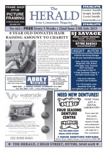 Page 26 • The HERALD • 22nd June 2023 v SAY YOU SAW IT IN THE HERALD v FLAT ROOFING SPECIALISTS All Roof Repairs Tel: 023 8184 5632 Mobile: 07880 508415 Email: steve@braithwaiteroo ng.co.uk THE FLAT ROOF SPECIALIST WESTWOOD BUILDING BUILDING & LANDSCAPING WE ARE A FAMILY RUN BUSINESS WITH OVER 40 YEARS EXPERIENCE BASED IN THE NEW FOREST. WE OFFER FREE QUOTATIONS AND ADVICE WHAT WE DO: • PATIOS • DRIVEWAYS AND BLOCK PAVING • GROUND WORKS • BRICK WORK • EXTENTIONS • GARAGE CONVERSIONS • CHIMNEY REPAIRS • ALTERATIONS • WE OFFER A FULL PLANNING AND DESIGN SERVICE TO SUIT YOUR PERSONAL REQUIREMENTS • FREE ESTIMATES • GUARANTEED WORKMANSHIP Call: 07725 002162 Email: westwoodbuilding@outlook.com • Foxhills, Ashurst, SO40 7ED The Tale of Iron Mill Common – part 1 by Robin Somes, Fawley and Blackfield Memories Just south-west of the Langley Tavern lies a small area of deciduous woodland, which doesn’t seem to have a name, and not being listed as Ancient Woodland, is probably not particularly old. South of this woodland lies the site of a 17th century ironworks. e clue that led to this curiosity was, once again, the 1838 Tithe Map of Fawley, where the area that’s now woodland was labelled as “Iron Mill Common”. Ironworks were rst recorded in Hampshire in the Domesday Book. It seems surprising, now at least, that such an industrialised process should have existed around Fawley in those days, but there were in fact two – the other being close to Fawley village itself. Isaac Taylor’s 1759 map of Hampshire shows “Iron Mills” somewhere (if the sketchy map is reliable) around Ashdown Hill or e Pentagon. Across the New Forest, there were several more; Sowley Pond supplied water power for two ironworks, for around 240 years, and at Iron’s Hill, near Lyndhurst, it’s believed there was another. e exact site of the Langley ironworks isn’t clear, e process of making iron needed a ready supply of ironstone (plentiful in the Barton Beds, and said to be easily obtained on the beaches along the coast, where it was washed out of the cli s), and of timber to make charcoal. It was generally easier to site an ironworks near the supply of timber, and transport the ironstone there from a distance, than vice versa. Over time, the use of local timber, mostly oak, for charcoal would have completely altered the landscape, a matter eventually controlled nationally by Acts of Parliament. It therefore seems likely that the area was originally ancient woodland, before being cleared to provide charcoal for the ironworks – when it became known as Iron Mill Common. Water-driven machinery would also be needed, to power the bellows in the furnace, and to drive the hammers to forge the iron, hence its location on the Dark Water. At larger sites such as Sowley Pond, a watercourse might be blocked to form an arti cial lake, which would provide a steadier supply of water during dry periods. Next time, we’ll look closer at the process of making iron at Langley. The site of Iron Mill Common (1838 Tithe Map of Fawley) but it was a little south of where the footpath from White eld Farm to Exbury crosses the Dark Water. Aerial photographs show the presence of excavated areas there. Although these may have been associated with the nearby White eld Brick Works, it’s also possible that ironstone was dug there, or that they mark the sites of furnaces. e mill was later converted into a corn mill, and that is said to have been demolished between the two world wars. Thank You Totton & Eling Bowls Club e Waterside Gateway Club had a fun day at the Totton and Eling Bowls Club, when they were invited to try their hand at bowls. It was a great opportunity and new experience for a lot of the members. e members were made very welcome by everyone at the bowls club and were divided into teams, with a couple of volunteers from the bowls club assigned to each group. ey stepped out onto the green in the glorious sunshine, ready to be taught the basics of playing lawn bowls. e friendly volunteers were very patient and gave everyone lots of helpful advice on how to play. e hardest part was trying to get the ball to roll in the direction they wanted it to, in order to hit the ‘Jack’. But as the volunteers explained, the balls are biased and follow a curved path, which sometimes ended up with them going where they weren’t supposed to, and torpedoing into the next group’s game! However, by the end of the session, many of the members had mastered it, and managed to hit the ‘Jack’, which resulted in shouts of delight and even some victory dances. e a ernoon nished with everyone getting together and chatting over mugs of tea, delicious sandwiches and cake in the club house. e Waterside Gateway Club wanted to say a big ‘ ank You’ to everyone at the bowls club, and all agreed it had been a brilliant day, which they would love to repeat again sometime. e Waterside Gateway Club is a club for adults with learning disabilities. Waterside Gateway Club at Totton and Eling Bowls Club Gentle Ramble Join Lepe Country Park Ranger Laura for a gentle 30-minute walk around Lepe, suitable for those with limited walking ability, on Monday 26th June and Monday 31st July at 9.30am. Laura will take you along accessible routes, making the most the picturesque environment at Lepe. Meet at e Lookout a couple of minutes prior to the walk starting. Free to attend, usual parking charges apply.