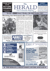 Est: 1994 v THE HERALD, 2 HIGH STREET, HYTHE, SO45 6AH v No 447 • FREE Every 3 Weeks • 5th-26th October 2023 The Your Community Magazine Call for a FREE Quotation 023 8078 3031 www.gasworks.co.uk Visit our showroom at 299 Shirley Road, Shirley, Southampton SO15 3HU Hythe, Waterside & New Forest: 023 8084 0257 Boiler Installation Services & Repairs 0% Finance Available Accredited Installer To book a complimentary Consultation Appointment call 023 8066 8886 www.dentureconfidence.co.uk Steve Martin D.D. (Hons), Dip CDT RCS (Eng) Denturist, Clinical Dental Technician GDC number: 140520 THE COMPLETE DENTURE CENTRE Helping you rediscover your smile • Dentures that look like natural teeth • Denture repairs with On-site laboratory • Expert denture advice • Referral processes for ALL your dental needs • Relaxed atmosphere for anxious patients BEFORE AFTER E s t a b l i s h e d 2 0 0 4 ANXIETY - PANIC ATTACK? Stay Calm, in Control & Relaxed. Break Free from a Fear or Habit. Regain Confidence & Happiness. Fast & Effective, Lasting Results. Call 07786 376980 E: alan@alanjoneshypnotherapy.com 7 & 9 The Marsh, Hythe SO45 6AJ • 023 8084 4131 • hythe@pearsons.com Now the busy summer is over, slow down and take stock this autumn. If you’re thinking of moving, your local Pearsons team are here to help Call in and book your free valuation with us today • Reliable and Efficient Service • Serving Trade, Domestic and Commercial Customers • Three sizes of bags available GRAB BAGS - A CHEAPER FLEXIBLE ALTERNATIVE TO A SKIP Tel: 023 8081 1757 • www.abbeygrabbag.co.uk • Call us for Prompt Delivery of a Bag • Fill Like a Normal Skip • Call again for a swift collection. • We can also collect your own grab bags 15 Marsh Parade, Hythe 023 8084 4741 FRAME SHOP HYTHE PICTURE FRAMING Blooming into Retirement after 55 Years Local florist, Sandra Griffin, owner of Sandra’s Florist has decided to retire after 55 years. Her shop in Holbury will close for the final time on Saturday 21st October, following a tea party, with cakes made by Doreen Hosey at 2pm. In March 1968, aged just 19, Sandra opened Sandra’s Florist in a small 10 by 6 shop in Fawley. e business soon out grew the tiny premises and she relocated to a shop just around the corner, taking on her rst trainee in 1976. Sandra’s Florist relocated to the shop in Holbury in 2009. Over the years Sandra has had the privilege to create flower arrangements for both Royalty including Her Majesty the Queen and the Princess Royal as well as many celebrities. Sandra comments: “I would like to thank all my current staff, Liz, Jadwiga, Nicole and Kevin for all their amazing work, also my daughter Tracey for looking after a lot of the background, website designs etc and helping during busy periods. To my wonderful regular customers, some have used us for years and over first and second generations - Thank you! All the lovely weddings over the years, Mum’s and the Daughter’s weddings - it was an honour!” Sandra Griffin Continued on page 3