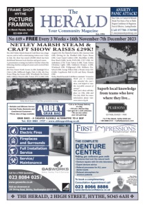 Est: 1994 v THE HERALD, 2 HIGH STREET, HYTHE, SO45 6AH v No 449 • FREE Every 3 Weeks • 16th November-7th December 2023 The Your Community Magazine Gas and Electric Fires Fireplaces and Surrounds Full Installation Service Service/ Maintenance Call for a FREE Quotation 023 8084 0257 www.gasworks.co.uk Visit our showroom at 299 Shirley Road, Shirley, Southampton SO15 3HU To book a complimentary Consultation Appointment call 023 8066 8886 www.dentureconfidence.co.uk Steve Martin D.D. (Hons), Dip CDT RCS (Eng) Denturist, Clinical Dental Technician GDC number: 140520 THE COMPLETE DENTURE CENTRE Helping you rediscover your smile • Dentures that look like natural teeth • Denture repairs with On-site laboratory • Expert denture advice • Referral processes for ALL your dental needs • Relaxed atmosphere for anxious patients BEFORE AFTER Established 2004 ANXIETY - PANIC ATTACK? Stay Calm, in Control & Relaxed. Break Free from a Fear or Habit. Regain Confidence & Happiness. Fast & Effective, Lasting Results. Call 07786 376980 E: alan@alanjoneshypnotherapy.com 7 & 9 The Marsh, Hythe SO45 6AJ • 023 8084 4131 • hythe@pearsons.com Superb local knowledge from teams who love where they live... • Reliable and Efficient Service • Serving Trade, Domestic and Commercial Customers • Three sizes of bags available GRAB BAGS - A CHEAPER FLEXIBLE ALTERNATIVE TO A SKIP Tel: 023 8081 1757 • www.abbeygrabbag.co.uk • Call us for Prompt Delivery of a Bag • Fill Like a Normal Skip • Call again for a swift collection. • We can also collect your own grab bags 15 Marsh Parade, Hythe 023 8084 4741 FRAME SHOP HYTHE PICTURE FRAMING NETLEY MARSH STEAM & CRAFT SHOW RAISES £29K! e 2023 Netley Marsh Steam & Cra Show was a huge success, and as well as entertaining visitors over 3 days in July, the show has raised £29,000 which has been distributed between local charities and good causes. A presentation evening was held in October where the following charities and good causes each received their donations: 6th New Forest North Scouts £1,500, Eastleigh B.S.A Club £1,500, Millbrook Rugby Club £1,500, 4th New Forest Eling Sea Scouts £850, Woodlands Pre-School £600, Colbury Church £200, Totton ATC £1,000, Little Angels £150, e Flutterby Fund £1,500, Gateway Club £500, Driving for the Disabled £500, Fryers House £500, Coast Guard Calshot £500, MacMillan £1,000, Rose Road £5,000, Jacobs Well £300, C.R.Y £500, Air Ambulance £750, Team Totton £1,000, Team Totton Christmas Lights £400, Oakhaven Hospice £1,000, Windward £500, Wildground £500, Mulberry PreSchool £500, George Dillon Only a Dream Away CIC £5,000, Copythorne Hall £1,250 and Hairy Houndz £500. Netley Marsh Steam & Cra Show comment: “A massive thank you to everyone who attended this year’s show, and helped us raise this incredible amount of money!” Next year’s show will take place on 19th, 20th and 21st July 2024! For more information please visit: www.nmscs.org.uk Netley Marsh Steam & Craft Show presentation evening