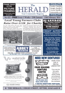 Est: 1994 v THE HERALD, 2 HIGH STREET, HYTHE, SO45 6AH v No 452 • FREE Every 3 Weeks • 25th January - 15th February 2024 The Your Community Magazine SJ SAVAGE BUILDING & PROPERTY MAINTENANCE • Extensions • Loft Conversions • All aspects of building works including Decorating 07788 868262 stevesavo@hotmail.co.uk Vehicle Servicing Garage For all your mechanical needs Tyres, Servicing, Clutches Diagnostic work, Brakes Cam Belts, Tyres, Exhausts, MOT’s arranged Servicing from £69.99 See Main advert page 75 Free local collection Courtesy cars available 114-118 Hampton Lane, Blackfield SO45 1UB www.rightautos.co.uk • 023 8089 0600 STAIRLIFTS STAIRLIFTS Freedom Stairlifts Straight Stairlifts Curved Stairlifts freedomstairlifts.co.uk FOUR SEASONS DENTURE CENTRE MORE THAN JUST A DENTAL LABORATORY If you want the best quality dentures in a relaxed, friendly and professional environment then call today for a free consultation Tel: 023 8084 6443 Mobile: 07919 074360 1 HOUR DENTURE REPAIRS North Road, Dibden Purlieu, Southampton SO45 4RE NEED NEW DENTURES? Quickstep Laminate Floors, Luxury Vinyl Tiles 15 Marsh Parade, Hythe 023 8084 4741 FRAME SHOP HYTHE PICTURE FRAMING • Reliable and Efficient Service • Serving Trade, Domestic and Commercial Customers • Three sizes of bags available GRAB BAGS - A CHEAPER FLEXIBLE ALTERNATIVE TO A SKIP Tel: 023 8081 1757 • www.abbeygrabbag.co.uk • Call us for Prompt Delivery of a Bag • Fill Like a Normal Skip • Call again for a swift collection. • We can also collect your own grab bags Local Young Farmers Clubs Raise Over £12K for Charity Two local Young Farmers Clubs have raised thousands of pounds for charity organising their annual tractor runs over the festive period. Romsey Young Farmers organised their Tractor Run themed All ings Christmas for Saturday 23rd December. Over 180 tractors took part in the convoy running from Michelmersh Manor Farm through to Broughton, Stockbridge, Kings Somborne and Romsey, nishing at West Dean Club. e event raised over £10,000 for their charities George Dillion Only a Dream Away and e Farming Community Network. Brockenhurst Young Farmers Tractor and 4x4 Run (Credit: Four Wheels Photography) Romsey Young Farmers Tractor Run (Credit: Keiron Yeo) Continued on page 3