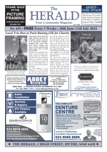 Est: 1994 v THE HERALD, 2 HIGH STREET, HYTHE, SO45 6AH v No 459 • FREE Every 3 Weeks • 20th June-11th July 2024 The Your Community Magazine Call for a FREE Quotation 023 8078 3031 www.gasworks.co.uk Visit our showroom at 299 Shirley Road, Shirley, Southampton SO15 3HU Hythe, Waterside & New Forest: 023 8084 0257 Boiler Installation Services & Repairs 0% Finance Available Accredited Installer To book a complimentary Consultation Appointment call 023 8066 8886 www.dentureconfidence.co.uk Steve Martin D.D. (Hons), Dip CDT RCS (Eng) Denturist, Clinical Dental Technician GDC number: 140520 THE COMPLETE DENTURE CENTRE Helping you rediscover your smile • Dentures that look like natural teeth • Denture repairs with On-site laboratory • Expert denture advice • Referral processes for ALL your dental needs • Relaxed atmosphere for anxious patients BEFORE AFTER Established 2004 ANXIETY - PANIC ATTACK? Stay Calm, in Control & Relaxed. Break Free from a Fear or Habit. Regain Confidence & Happiness. Fast & Effective, Lasting Results. Call 07786 376980 E: alan@alanjoneshypnotherapy.com 7 & 9 The Marsh, Hythe SO45 6AJ • 023 8084 4131 • hythe@pearsons.com pearsons.com 15 Marsh Parade, Hythe 023 8084 4741 FRAME SHOP HYTHE PICTURE FRAMING • Reliable and Efficient Service • Serving Trade, Domestic and Commercial Customers • Three sizes of bags available GRAB BAGS - A CHEAPER FLEXIBLE ALTERNATIVE TO A SKIP Tel: 023 8081 1757 • www.abbeygrabbag.co.uk • Call us for Prompt Delivery of a Bag • Fill Like a Normal Skip • Call again for a swift collection. • We can also collect your own grab bags Local Trio Run to Paris Raising £5K for Charity Joshua Bond, Xavier Bond and Ashley Bateman all from the Waterside, recently took part in the Run2Paris challenge, alongside their team mates Peter Daines (Joshua and Xavier’s Uncle) and his friend David Taylor who are both from Norfolk. Run2Paris is an organised event which is only in its third year, raising money for Parkinson’s UK and Armed Forces Charity SSAFA. It’s a relay run starting from Wimbledon in London all the way to the Ei el Tower in Paris, via a ferry from Newhaven to Dieppe. The total distance of the challenge is 225 miles which was run over 4 days, with each person in the team running one leg each day, whilst the rest of the team travelled by car to the next checkpoint, ready to clap them in and send their next runner o . e rst day the team had to try and sleep on the overnight ferry and a er that they camped each night. On the nal run, the whole team came together to run the nal mile to nish as a team under the Ei el Tower. The team have raised an amazing £5,345, with the event raising around £111,000 in total. Joshua comments: “It was a fantastic experience, the whole event was really well organised by the Run2 team and a massive amount was raised for the charities thanks to all the kind donations from our supporters.” At the finish line in Paris. (left to right) Xavier Bond, Joshua Bond, Ashley Bateman, Peter Daines, David Taylor