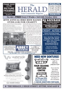 MOBILITY SCOOTER, good condition, Quingo Classic, littled used, new batteries, cost £3000 new, now £495. Tel: 023 8081 1613 or 07960 050077. WALKING FRAME, with front walking frame glides for back, bought 04/04/2023 £55, for sale £20. Tel: 07803 815225. MUSIC GROUPS PETS & ACCESSORIES 3rd October 2024 • The HERALD • Page 87 v EMAIL THE HERALD ON editor@herald-publishing.co.uk v u HERALD CLASSIFIEDS u Paper from responsible sources FSC® C020438 MIX ® The Herald is printed on FSC certified material SPEAKERS WE DO NOT TAKE FREE ADS OVER THE PHONE PLEASE EMAIL: editor@herald-publishing.co.uk OR POST YOUR FREE ADS TO US AT 2 HIGH STREET, HYTHE, SOUTHAMPTON SO45 6AH COULD YOU give a stray or unwanted pet a loving home? Call Lymington Cat & Kitten Rescue on 01590 678233 or visit our website at www.lymicat.org. Please support our SOS Appeal to secure our charity’s future - your donations are vital. EAST BOLDRE Hedgehog Rescue urgently needs donations of meaty cat food including cat biscuits &/or Spikes Hedgehog food. Tel: 07595 709617. HAMSTER CAGE, large, £20. Hamster cage, small, £15. Gerbil cage, £20. All good condition with lots of accessories. Tel: 07407 328985. to: Unit 6, New Forest Enterprise Centre, Chapel Lane, Totton, Southampton, SO40 9LA. WANTED – FOREIGN coins and notes in all currencies, old and new. Take them into The Herald office at 2 High Street, Hythe, SO45 6AH who take them in for Hythe Pier Heritage Association. WANTED: GOLD/SILVER – good, broken or odd pieces, also old coins, any condition, best prices paid in cash. Tel: Pete 07768 527162. WANTED: Has anyone got a spare patch of garden they don’t use? I am looking for a plot to grow veg/flowers in return for rent or to share produce in the Fawley area. Call Mike: 07510 285417. WANTED – Honda C90 Cub motorcycle, would prefer 1998 or earlier model, ideally one owner, low mileage, in very good condition. Please email: recycledreading@gmail.com WANTED – HORNBY Dublo 3 rail model railway items, Dinky Dublo vehicles also wanted. Anything considered. Please phone Colin with details on: 023 8087 9926. WANTED USED Mobility Scooters. Pop into Waterside Furnishings and Re-Upholstery in Hythe or call Richard on: 023 8020 7895. WANTED – Old Norton motorcycle by an old enthusiast to restore and ride. Also any 1950’s era TT items. Anything cheerfully considered. Please email: recycledreading@gmail. com WANTED – Old and obsolete Dinky, Corgi Matchbox and Spot-on models, any condition considered, also railway items, Engines, Goods Wagons and Coaches, please call: 023 8087 9042 or: 07786 722363 for a chat, any old toys considered (not boxed games). WANTED - old football programmes (pre 1940’s preferably) and any sporting memorabilia. Good prices paid by keen collector. Please call Steve: 07588 035302 or email: sbroad1980@gmail.com WANTED – OLD unmade model kits, Airfix, Tamiya etc. Cash paid for odd items or collections. Tel: 07708 620910. WANTED - OLDER Hampshire bike enthusiast wants a project bike to tinker with and bring back to life and ride. Cash or clearance. Ring or message 077483236119 Tony. WANTED – Records bought by collector, LP’s and 45’s/singles, from 1950’s, 60’s, 70’s, 80’s and 90’s. Rock, prog, psyche, folk, pop, R&B, blues, funk soul, reggae, ska, jazz, film scores and classical. All types of music considered for cash. Will always pay a fair price for your vinyl. Any quantity - large or small. Call Robert: 07518 148126. WANTED - Vintage Men’s Watches by collector, 1950’s-1990’s, Rolex, Omega, ex-military etc. Sports/diving/chronograph types preferred. Any condition, working or not. Please call: 07779 622172. WANTED EXPERIENCED PROFESSIONAL cruise ship speaker offers to come and present to local groups in return for a donation to Romsey Cancer Support Centre, Jane Scarth House. Please see my Facebook page, ‘Julian Gee - The Entertaining Speaker’ for more information and to discover my current list of varied talk topics, ranging from nostalgia to celebrities! Or drop me an email to enquire or make a booking: gconsultant42@gmail.com. INTERESTING EXPERT SPEAKER. Help to local organisations. Cruise ship guest lecturer on The Secret Saboteurs of WWII and a few of the amazing double agents. Topics include remarkably brave women and the previously secret exploits of spies etc. Visit: pgpower9.wixsite.com/my-site Email Peter Power: p.g.power@btinternet.com LOCAL HISTORY TALKS from lifelong resident and experienced speaker. Available at relatively short notice. Titles are ‘From the Heath Hotel to Dibden Church, an historical journey’; History of Dibden Purlieu 1900 to 1960’; Then & Now images of Dibden and Dibden Purlieu’; Growing up in Dibden Purlieu in the 1950’s; in conjunction with Alan Lines ‘From a photograph to a War Memorial’; and ‘Robert Gerard Fox; the Kaiser’s Tutor’, ‘Langdown Lawn (Golden Hind Park)’ and ‘Fred Nicklen – The Road to Lismany’. Telephone Gordon Chambers: 023 8084 4749. MAGIC BEHIND the Scenes, talk and magic interwoven for a fascinating insight into the world of magicians. Roger Daniels, Member of the Magic Circle: 023 8084 3537 or: 07718 489327. MINSTEAD TRUST and Furzey Gardens: for your community group or association, available charity speaker to talk about the inspiring story of Minstead Trust, local learning disability charity or the history of Furzey Gardens with botanical interest. Find out how Minstead Trust came to exist and learn of the motivational people that shape it and are part of it today. How Minstead Trust is supporting vulnerable people in society. Horticulturalists will love the history of Furzey Gardens talk. Contact Lesley.brooks@minsteadtrust.org.uk OPEN SIGHT, Hampshire’s principal sight awareness & support Charity, can visit your afternoon Social Club or Group to give its presentation ‘Keeping Your Eyes Right’ which covers advice on good eye health care and tips on sight loss prevention